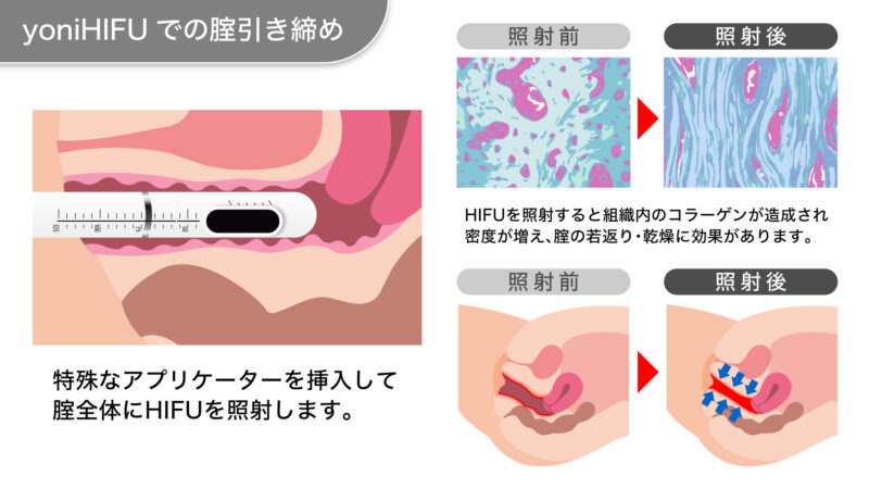 HIFUによる膣縮小の治療法です。膣内にハンドピースを挿入し、超音波による熱エネルギーを照射することで骨盤底筋群を引き締めるとともに弾力性を与えます。痛みの少ない安全で精密な膣治療です。施術後にはコラーゲン線維の収縮による引き締め効果が感じられ、長期的に新しいコラーゲンの再生により緩んだ壁や窓口を強力に引き締めます。膣のゆるみ、尿もれ、お湯漏れ(お風呂に入ると膣内に水が入る)、萎縮性膣炎の予防、性交痛の改善などに効果的です。